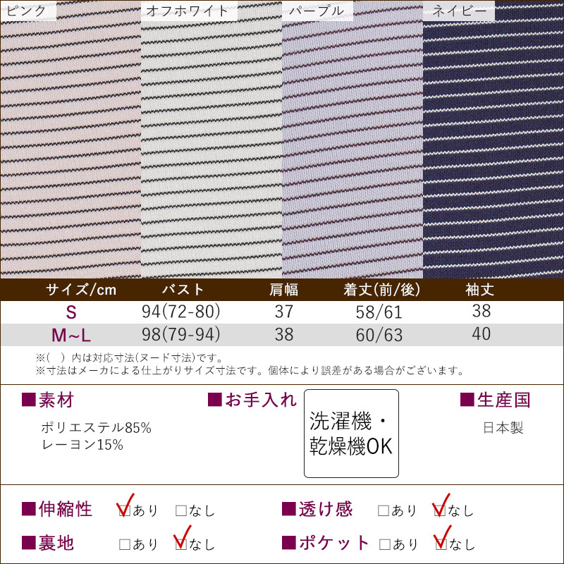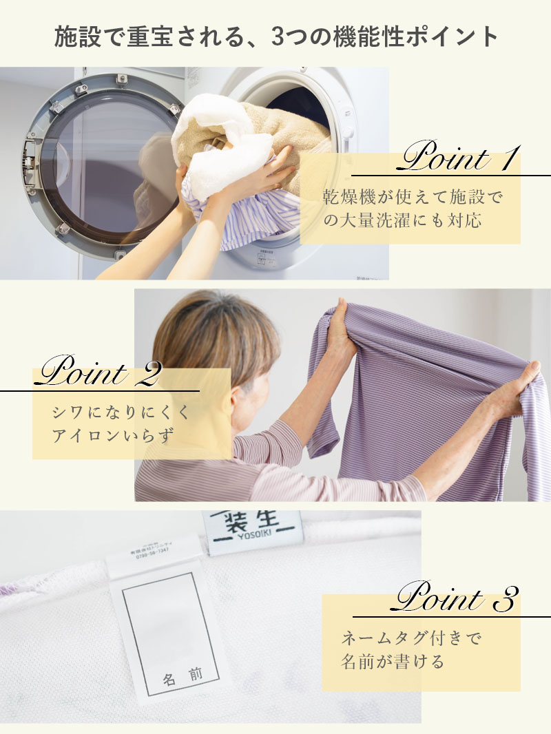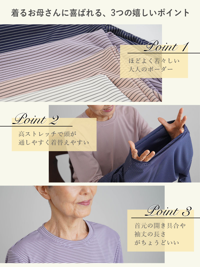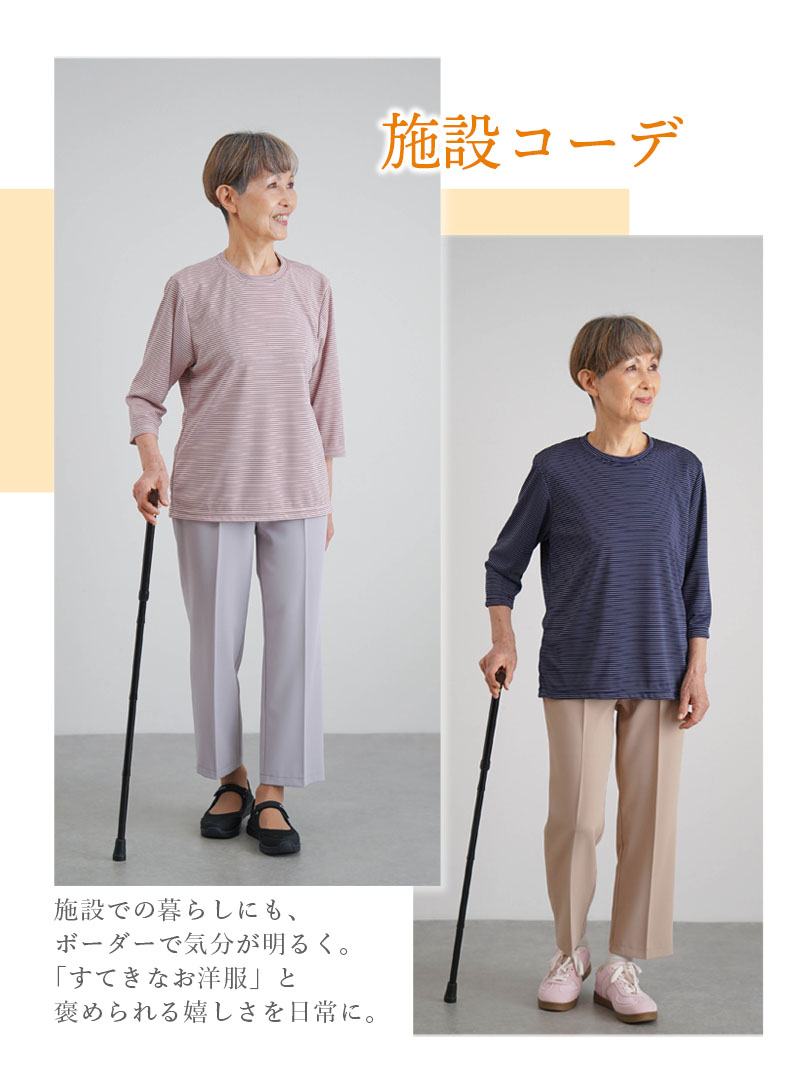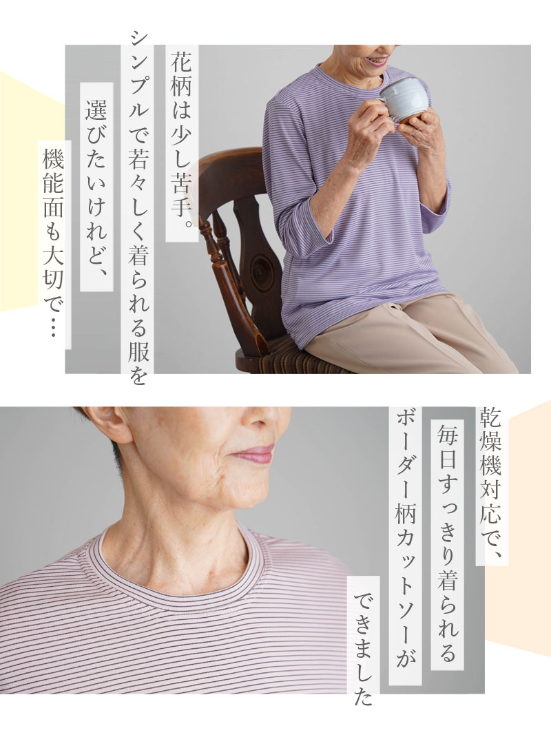 | ● 乾燥機対応のボーダー柄七分袖カットソー。 ネームタグ付きで衣類管理がしやすく、施設入所やデイサービスなど施設での暮らしにおすすめの一枚です。毎日の洗濯から乾燥まで安心して使えます。 ● 春~秋に活躍する薄手素材で、夏も涼しくさらさらとした着心地。ストレッチ性・伸縮性が高く、体の動きにやさしくフィットします。 ● シワになりにくく、アイロンいらず。乾燥機対応でも形が整いやすく、施設での大量洗濯や日常使いに扱いやすい仕様です。 ● 首元が出すぎないクルーネックに、使い勝手のよい七分袖。冷房・エアコン・クーラーの風が気になる日にも着やすく、後ろ長めの裾が座ったときの腰まわりをさりげなくカバーします。 ● シンプルでおしゃれなボーダーデザイン。 派手すぎず若見えする色柄で、施設での普段着にもおでかけにも合わせやすく、「すてき」と褒められる嬉しさを日常に。日本製で贈り物にもおすすめです。 (素材)ポリエステル85% レーヨン15% (サイズ展開)S・M-L (カラー展開)ピンク・オフホワイト・パープル・ネイビー (生産国)日本製 |