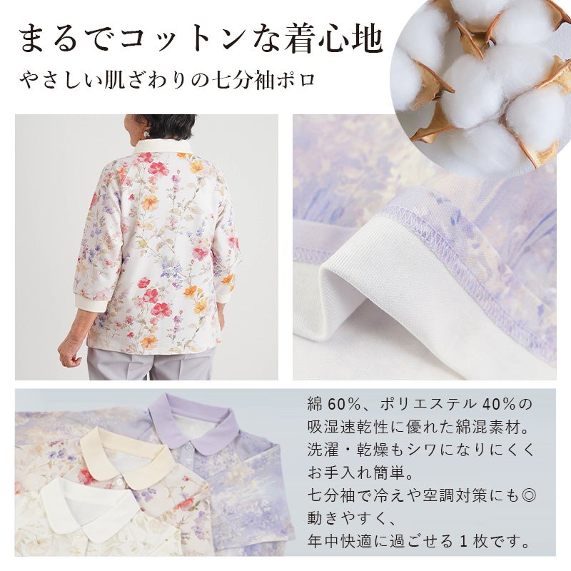 [装生] 乾燥機対応 婦人 花柄プリント 七分袖 全開ポロシャツ