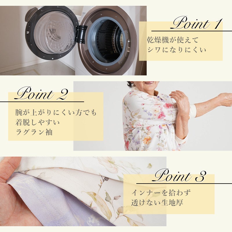 | 機能性と上品さを兼ね備えた、綿60%・ポリエステル40%混合の花柄プリント七分袖プリントポロシャツ。 柔らかいコットンの感触が心地よく、日常使いにぴったりです。 ●乾燥機対応で施設での洗濯も安心。縮みにくくお手入れラクラクです。 ●腕が上がりにくい方でもラクに着られるラグラン袖&前開き仕様。 ●大きめボタンと斜めホールで、指が動かしにくくても開け閉めしやすい。 ●七分袖&裾スリット入りで、動きやすさと清潔感を両立。 ●花柄プリント×バイカラーデザインで、一枚でも華やかさが際立ちます。 (素材)綿60% ポリエステル40% (サイズ展開)S・M-L・LL (カラー展開)オフホワイト・ラベンダー・アイボリー (生産国)中国製 |