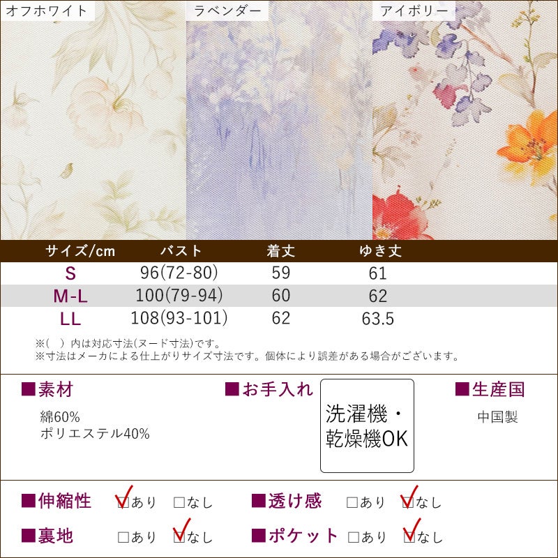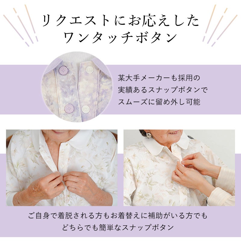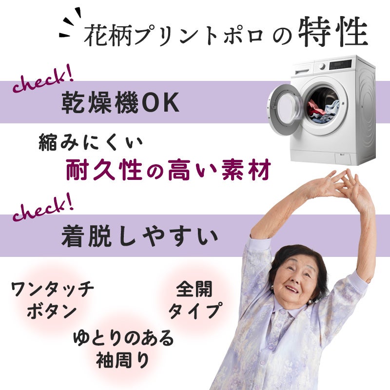 | 機能性と上品さを兼ね備えた、綿60%・ポリエステル40%混合の花柄プリント七分袖スナップボタンポロシャツ。 柔らかいコットンの感触が心地よく、日常使いにぴったりです。 ●乾燥機対応で施設での洗濯も安心。縮みにくくお手入れラクラクです。 ●腕が上がりにくい方でもラクに着られるラグラン袖&前開き仕様。 ●大きめボタンとワンタッチで留め外し可能なスナップボタン採用で着脱簡単 ●七分袖&裾スリット入りで、動きやすさと清潔感を両立。 ●花柄プリント×バイカラーデザインで、一枚でも華やかさが際立ちます。 (素材)綿60% ポリエステル40% (サイズ展開)S・M-L・LL (カラー展開)オフホワイト・ラベンダー・アイボリー (生産国)中国製 |