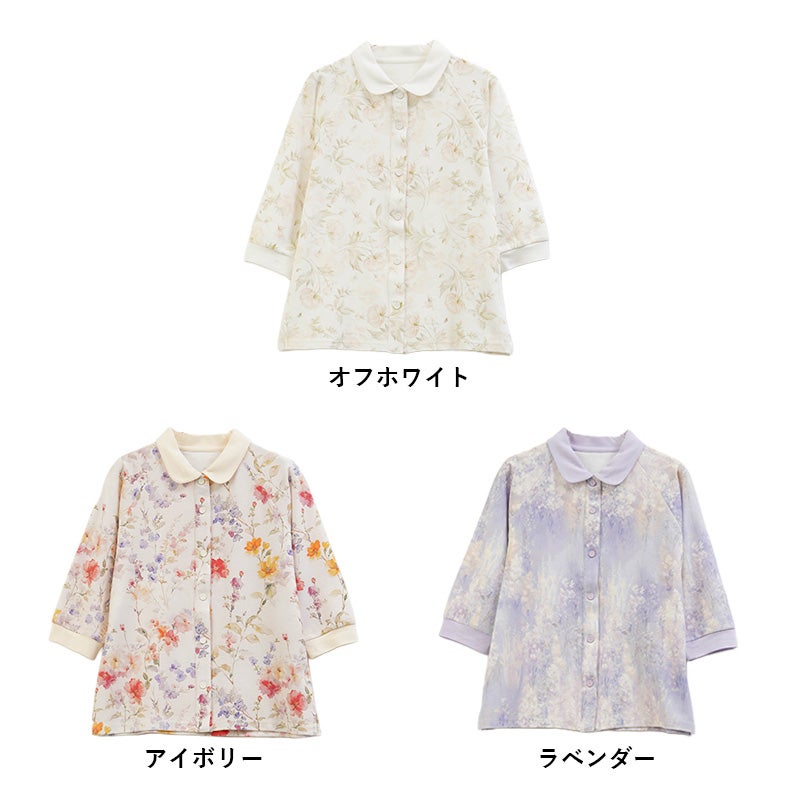 [装生] 乾燥機対応 婦人 花柄プリント 七分袖 全開スナップボタン ポロシャツ