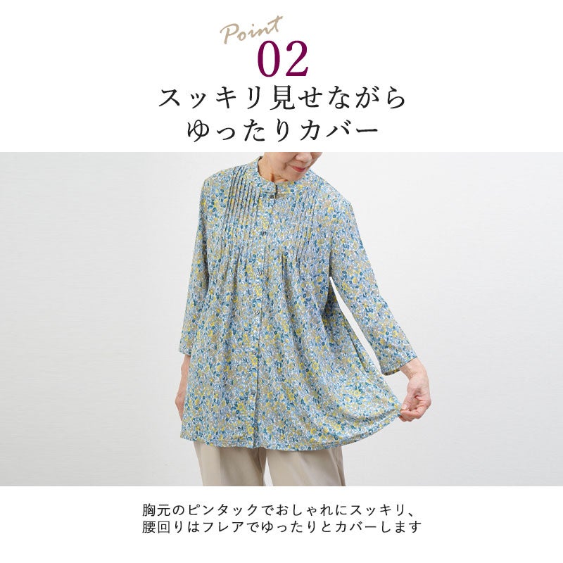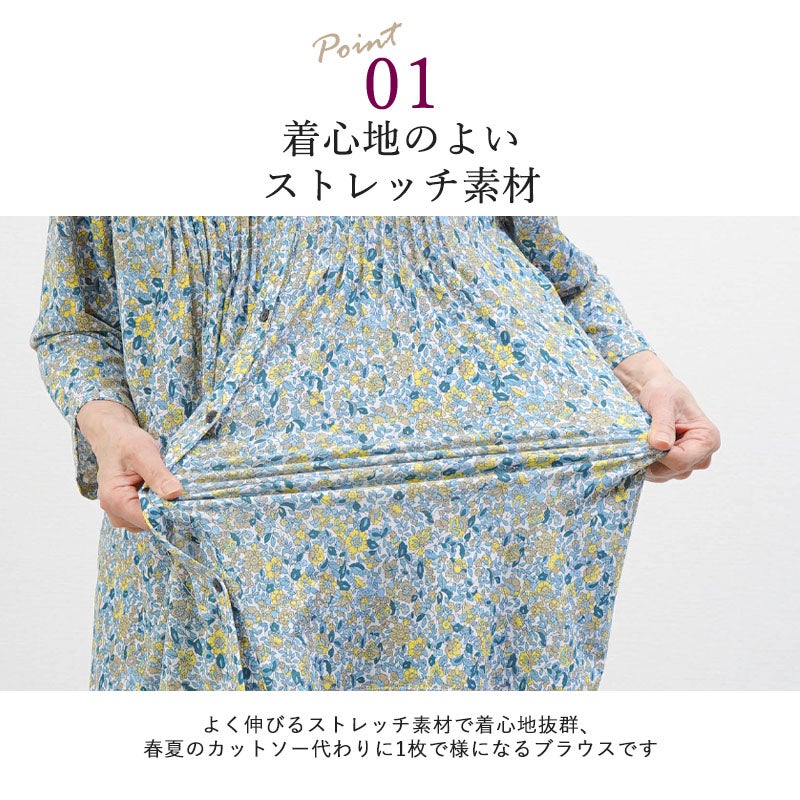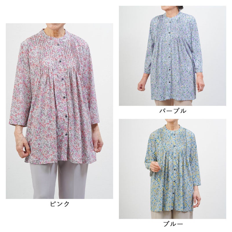 花柄 ピンタックストレッチ 七分袖ブラウス