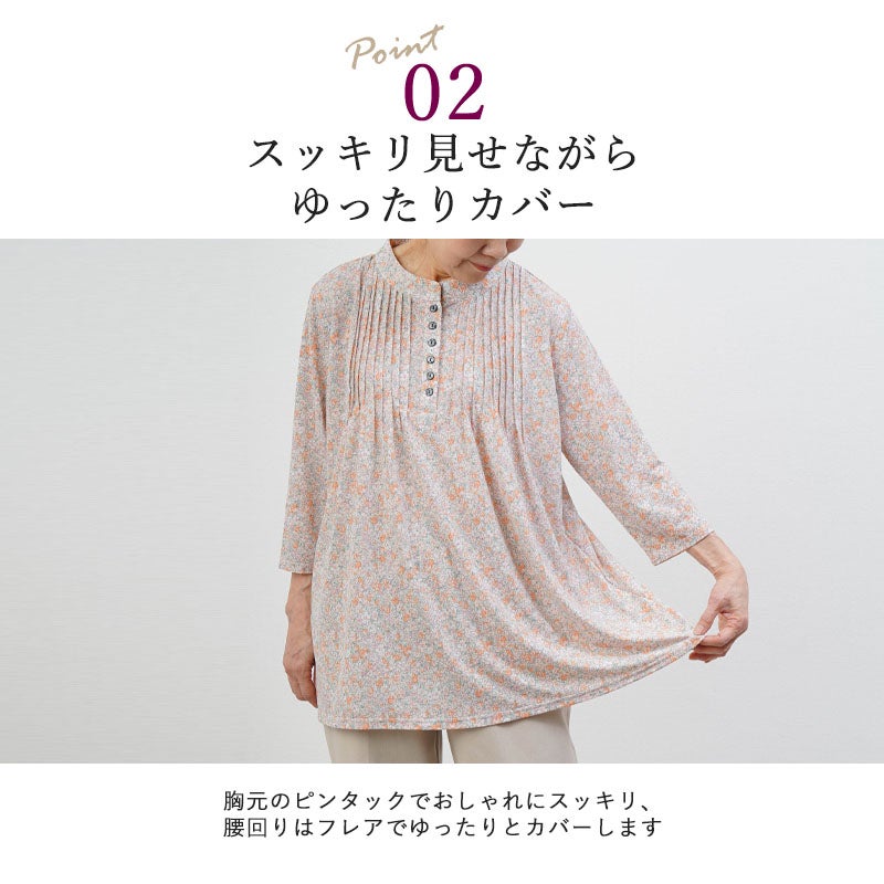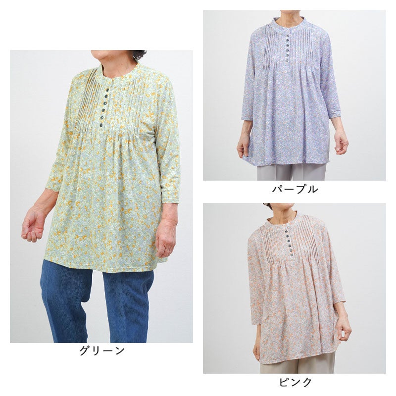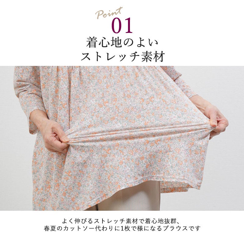 花柄 ピンタックストレッチ 七分袖ブラウス