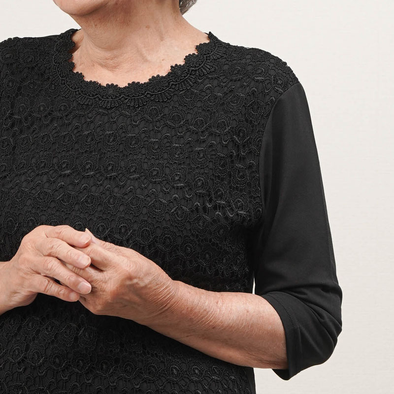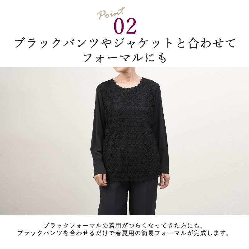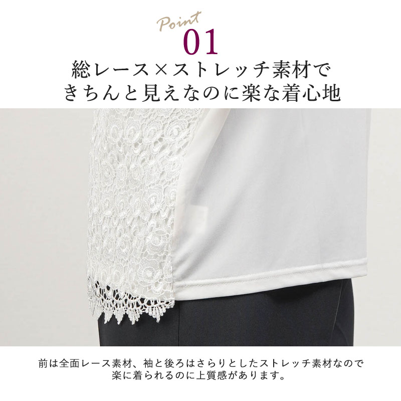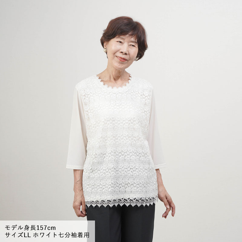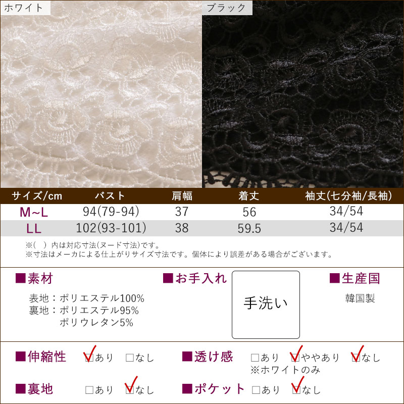 | ●一面の総レースがエレガントなカットソー。 前は全面レースで高級感がありきちんと見え、後ろと袖はストレッチ素材なので楽な着心地。 ●ブラックパンツやジャケット、カーディガンなどを合わせてフォーマルでの着用もおすすめです。 ●長袖と七分袖をご用意しており、春夏の着用に最適です。 (素材)表地:ポリエステル100% 裏地:ポリエステル95% ポリウレタン5% (サイズ展開)M-L・LL (カラー展開)ホワイト・ブラック (袖タイプ)七分袖・長袖 (生産国)韓国製 |